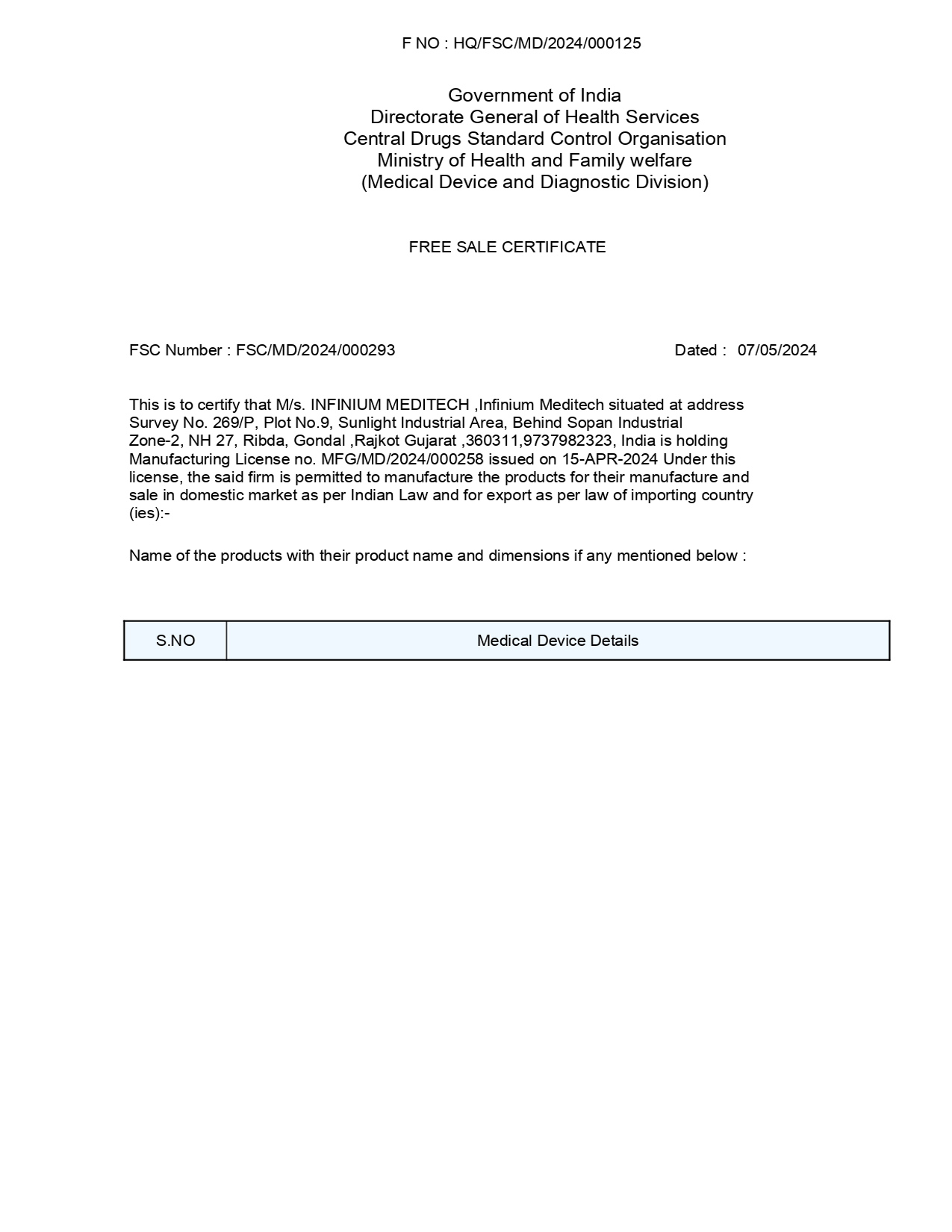 FREE SALE CERTIFICATE